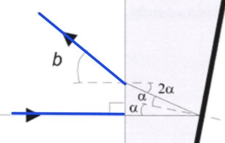 Ja, den vinkel som efterfrågas är vinkeln mellan den inkommande strålen och den reflekterade strålen (blåmarkersde). Denna vinkel är b.. Vilken del av lösningen I facit vill du att vi förklarar närmare?