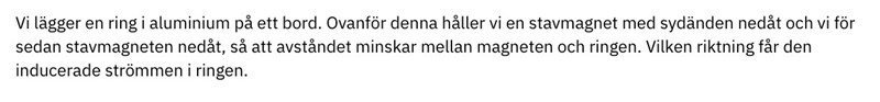 Ok, men vi vet inte ifrån uppgiften vilket håll man ska säga att den inducerade strömmen är riktat, dvs moturs eller medurs. Så uppgiftsbeskrivningen är otillräcklig eller?