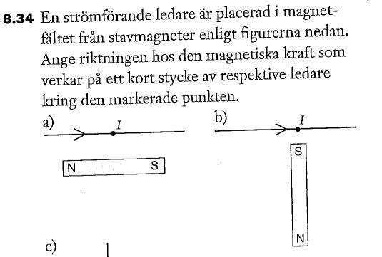 Hej, behöver hjälp med b). Jag vet att magnetfältet hos stavmagneten går från nordpolen till sydpolen, men hur ska man veta hur magnetfältets riktning då blir i den svarta pricken. Om nu magnetfältet har den riktningen som jag säger så bör väl det i punkten även vara så att magnetfältet fortsätter med den riktningen om man skulle förlänga flödeslinjerna. Detta gör att jag enligt högerhandsregeln får att kraften pekar rakt ut ur papprets plan, men facit säger det motsatta? Vad gör jag för fel?