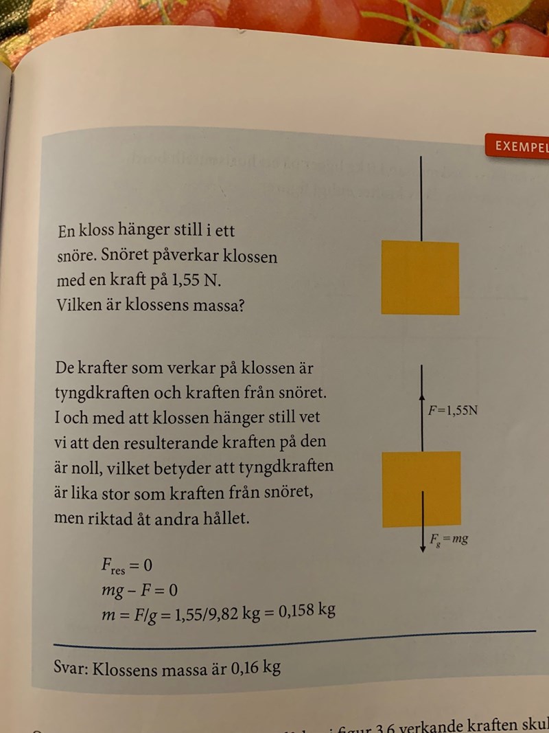 Så om du vet att mg = 0.158 kg * 9.82 = 1.55 N, innebär det att kraften är värd ungefär 1.55 Newton, men kraften går i den negativa riktningen (i det här fallet nedåt). Du behöver inte beskriva alla riktningar i dina beräkningar, bara i slutresultatet efter att ha skapat en antagande om vad är positivt och negativt.