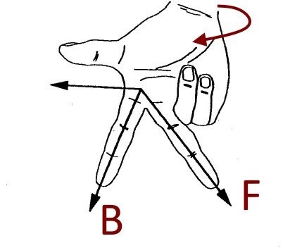 Vrid sedan handen (utan att ändra på fingrarna) så att pekfingret (B) fortsätter pekar nedåt (mot golvet) samtidigt som långfingret (F) pekar åt vänster. Inte kan du väl på något sätt få tummen att peka mot dig då (utan att böja in tummen eller fuska på annat vis)?