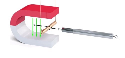 Hur blir strömriktningen genom kopparstaven om dynamometern visar 0,03 N?