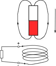 När stavmagneten förs mot spolen så får man spänning och ström på det här viset. I detta fallet kan man se spolen som en spänningskälla och om du följer strömmen runt så ser du att den går från minuspolen till pluspolen genom spolen. (Polariteten och riktning på strömmen gäller bara så länge magneten närmar sig).