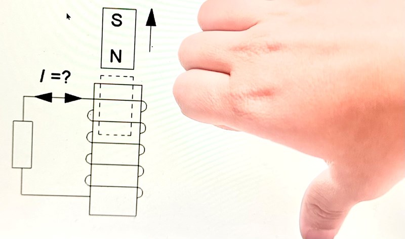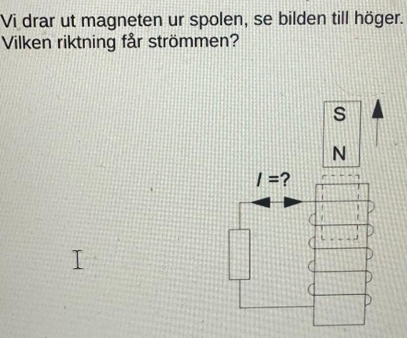 jag vet att när magneten tas ut från spolen, spolen kommer försöka dra tillbaka magneten genom att skapa en sydpol vid den gråa markeringen och jag antar då att en nord pol bildas under den. Men hur kan jag använda högerhands regelerna för att hitta riktningen på strömmen