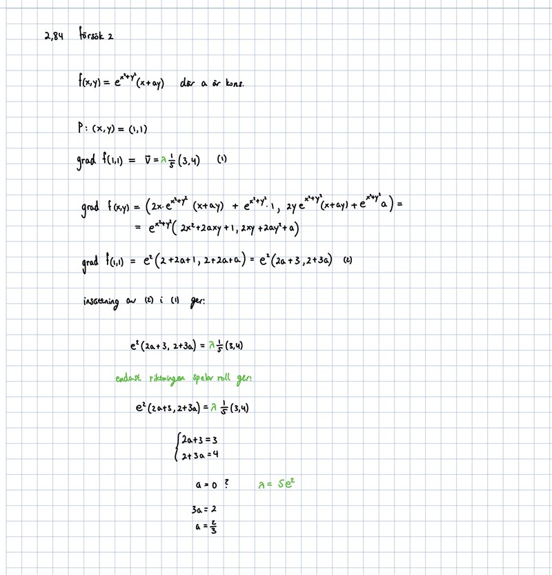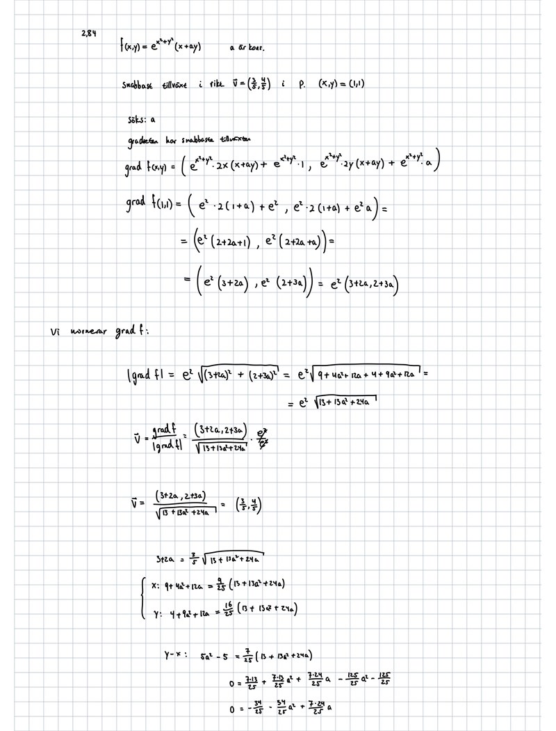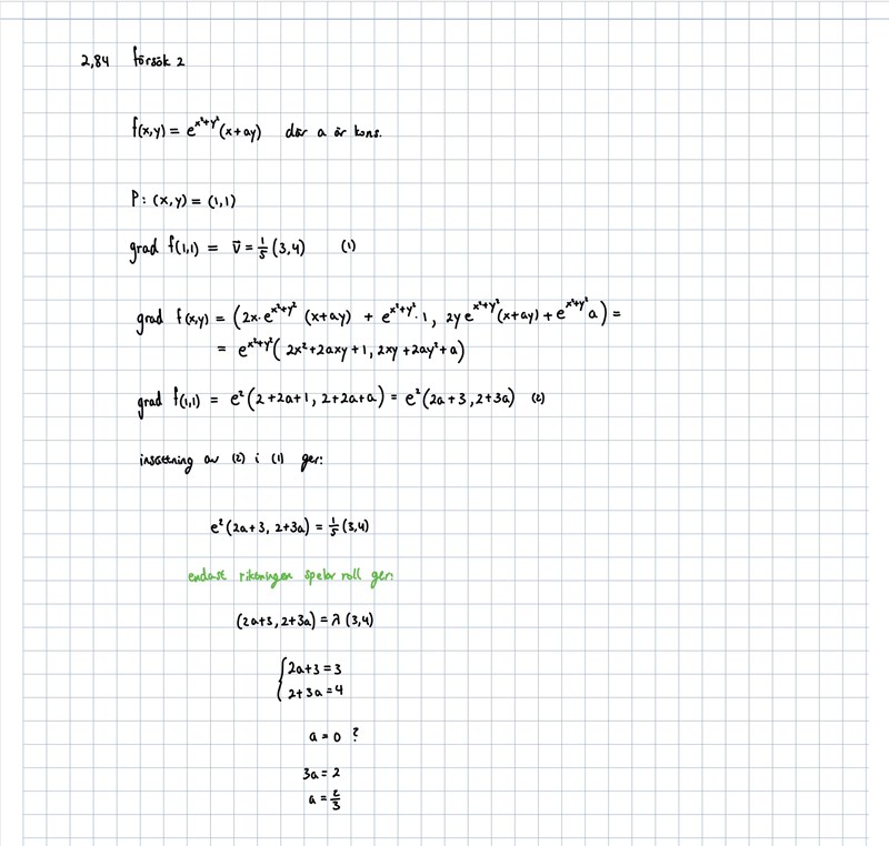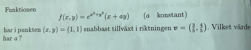 Qetsiyah skrev:Alltså gradf(1,1) har du ju räknat ut, och som du vet så ger vektorn (R2) rikningen i vilken f ökar snabbast. Som du ser i uttrycket för ∇(1,1) så beror den av valet av a. Nu ska vi alltså välja a sådant att riktningen är samma som v. Lambda finns där för att vi, som du säger, inte bryr oss om dess magnitud, bara det är åt rätt håll.