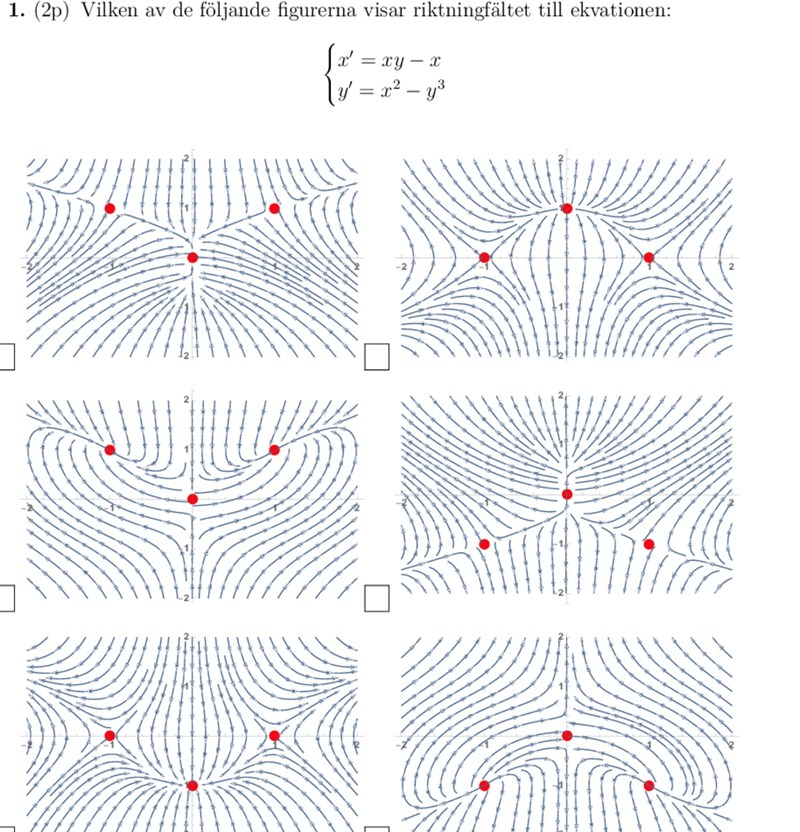 De kritiska punkterna är inritade i figurerna. Vilken eller vilka har samma kritiska punkter som diffekvationerna?