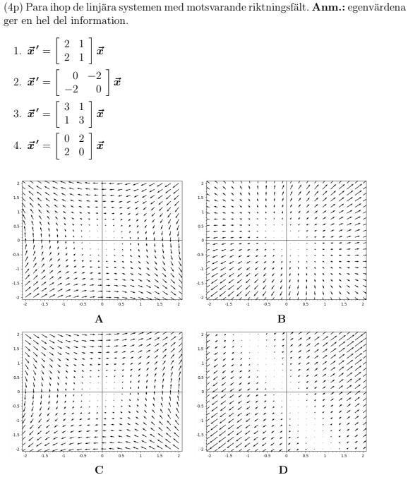 Hur ska man tänka kring den här typen av uppgifter där man ska matcha saker och ting med rätt riktningsfält. Om det var ett uttryck givet kunde jag testa med teckentabell och insättning av olika värden osv men hur gör man när man har ett linjärt system, eller typ dx/dt = sin(x), dy/dt = cos(y), matcha med rätt riktningsfält?