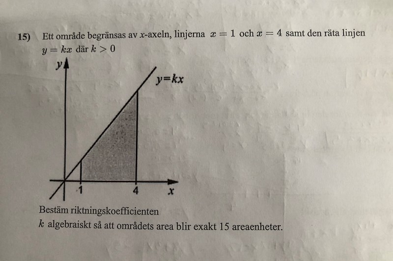 Hörnens y-värden är k och 4k. Använd formeln för arean av en sån figur och sätt den lika med 15 så får du sedan ut k.