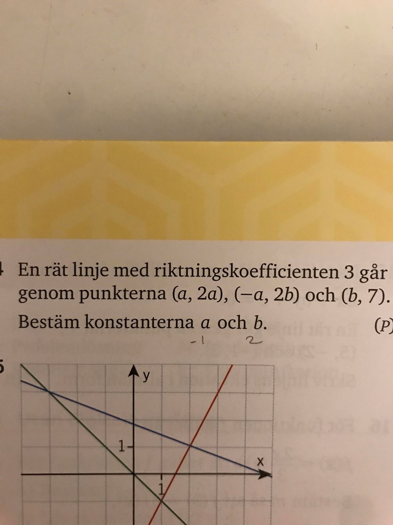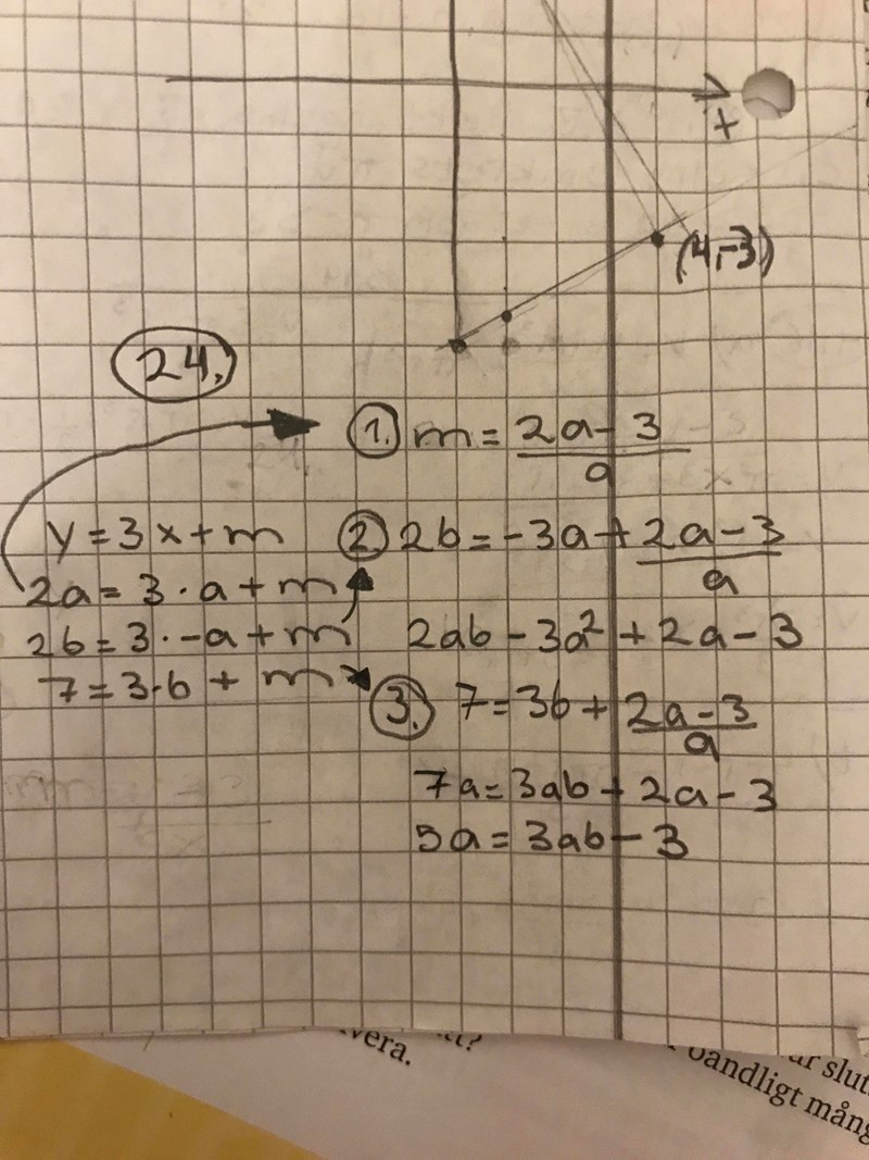Ställ upp ett ekvationssystem med tre rader, där du sätter in värdena av de tre punkterna (linjens ekvation: y=3x+m). Förstod du?