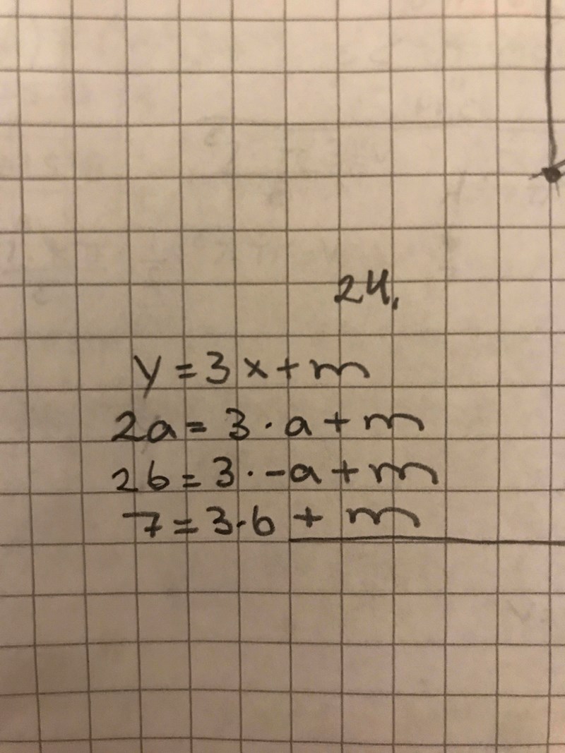 Man behöver nog inte göra så, bara tillämpa ordinarie ekvationssystem lösning. För att lösa ut m kan du multiplicera 2a=3*a+m med 2, och multiplicera 2b=3*-a+m och 7=3*b+m med -1, och sedan har du kvar att lösa a och b (få fram dessa variablers värden).