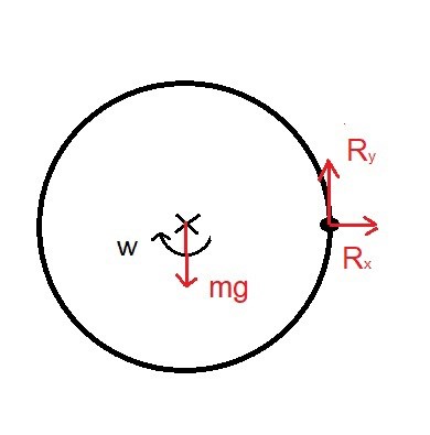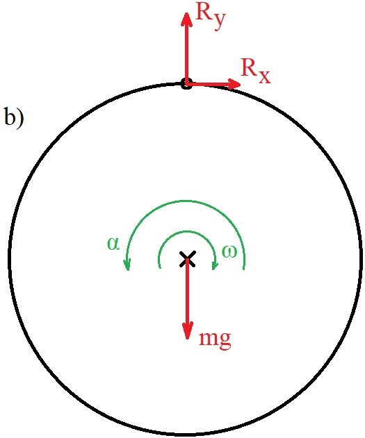 b) Med vinkelhastigheten från a) i det nedersta läget, samt att ringen tar sig precis över rotations axel och sedan börjar rotera. Hur stor är då kraften som verkar från axeln på ringen i det ögonblick ringen passerar det nedersta läget?