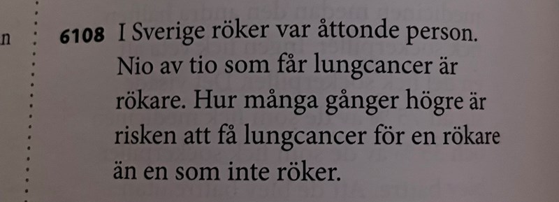 Det listade jag ut ganska snabbt också. Antog att det var onödig information tillagd för att förvirra lite. Men jag vet fortfarande inte hur resten av informationen kan ge mig svaret på frågan. :( Det är ju inte 90% risk att alla rökare får lungcancer och 10% risk att icke-rökare får. Det är ju helt orimligt.
