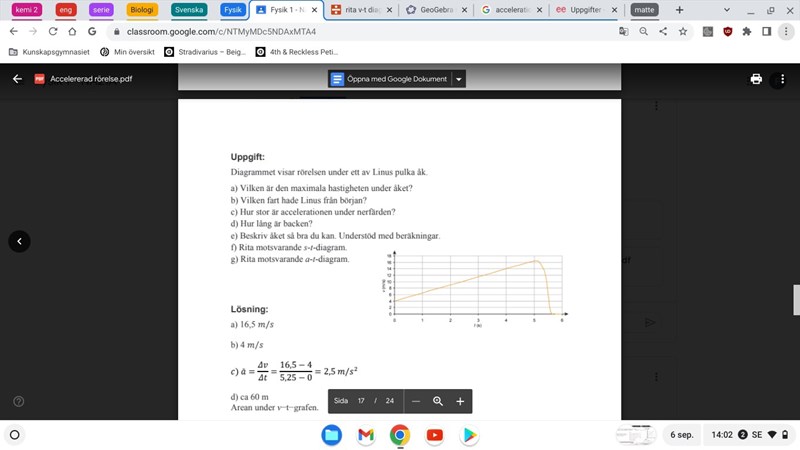 f) Förstår att för att få reda på sträckan så måste man ta hastighet * tid och för tiden 0s är hastigheten 4 så sträckan borde starta vid 4s och vid 1s så är hastigheten 6,5 ungefär så sträckan bör gå upp till 6,5 osv, vill bara veta om jag tänker rätt, för på bilden nedanför stämmer min uträkning till en början men sedan blir det fel. Tex vid tiden 4s är hastigheten 14, 14*4 blir 56 men i s-t diagramet nedanför är 4s vid sträckan 40