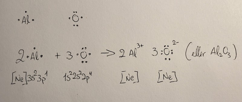 Låt mig ge dig också ett exempel på hur aluminiumoxid bildas. Som du vet tillhör aluminium grupp 13 och den har 3 valenselektroner. Syre tillhör grupp 16 och vill jättegärna få två elektroner. Båda ska uppnå ädelgasstruktur. Det kommer att se ut såhär enligt Lewisstruktur. Jag skrev elektronkonfigurationer under grundämnena.