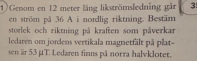 Ja, strömmen går rakt norrut och jordens vertikala magnetfält är riktat mot jordens centrum, dvs vinkelrätt mot ledaren