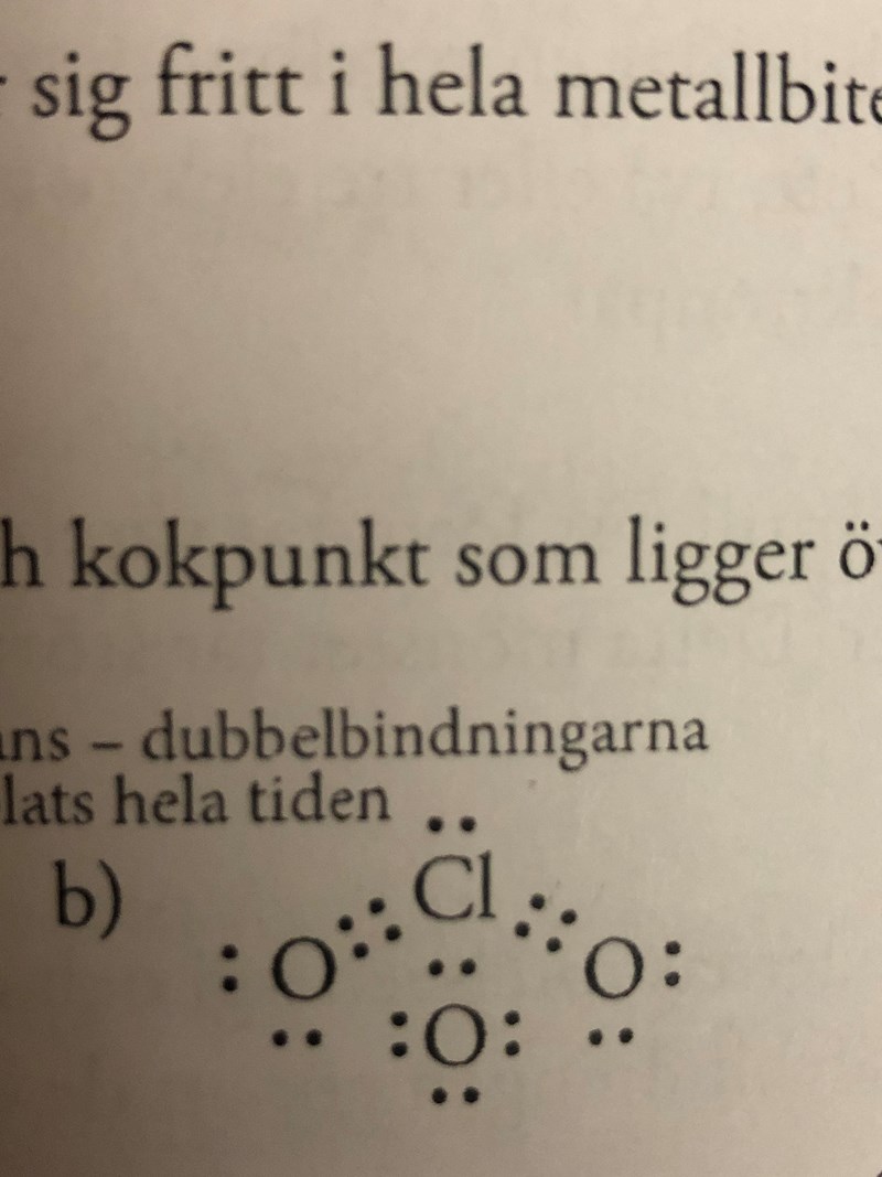 Är det rätt att rita så? I facit så står det resonas dubbelbindningar vilket jag inte förstår. Det står också att klor ska ha 10 elektron runt omkring sig. Vilket jag inte förstår? Varför ska det finnas 10 elektroner?