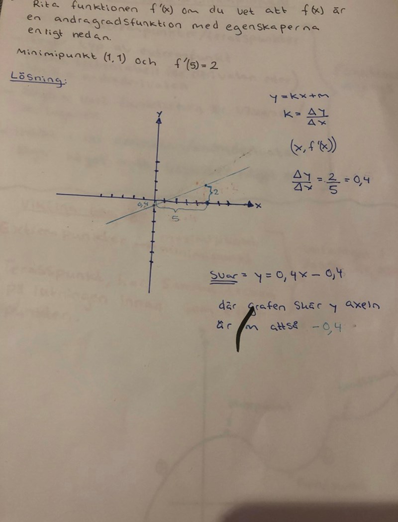 Minimipunkt för f i (1,1) ger (1,0) som del av f'-kurvan (som du även ritat) vilket tillsammans med den kända punkten (5,2) ger att k-värdet för f' ges av .