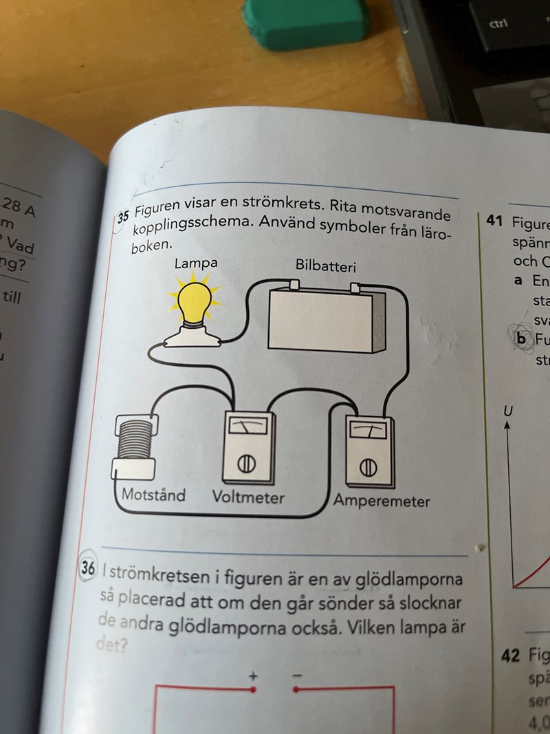 Hej! Jag undrar om jag kan få hjälp med att förstå hur man ska tänka när man ritar en strömkrets. Jag har försökt på uppgiften nedan och jag ritade nästan rätt förutom att jag hade motåndet i en parallell koppling istället för voltmetern: