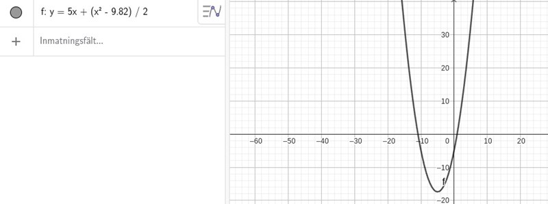 Jag tänkte att jag kunde använda formeln för att få en funktion, och därmed en graf i geogebra, då S(sträcka) ligger på y axeln, och t(tiden) ligger på x axeln. Alltså såhär(s=y och t=x):