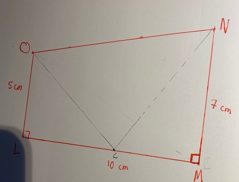 Uppgiften säger inte var på sträckan LM som punkten ligger, vilket gör det krångligt. :/ jag tänkte att man kan använda "Pythagorean Theorem trapezoid" när LM är summan av OL och NM.