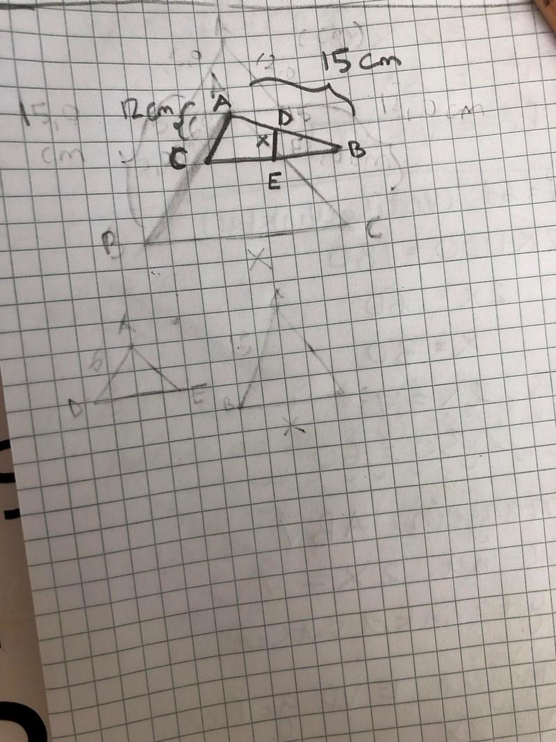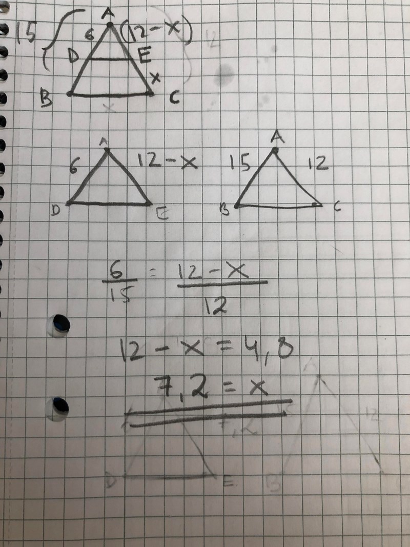 Hej! Har jättesvårt att rita figuren korrekt utifrån informationen man får från uppgiften. Exempelvis Ma2b 3227: I triangeln ABC är AB=15,0 cm och AC=12,0 cm. En rät linje parallell med BC träffar AB i D och AC i E. Man vet att AD=6,0 cm. Beräkna CE.