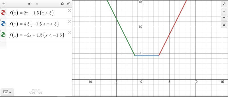 För att lösa dessa typer av uppgifter så kan du rita ut de funktionerna y = 2x-1.5, y = 4.5 och y = -2x+1.5 och sedan markera ut punkterna där där de förändras, dvs x=-1.5 och x=3. Det borde se ut som följande: