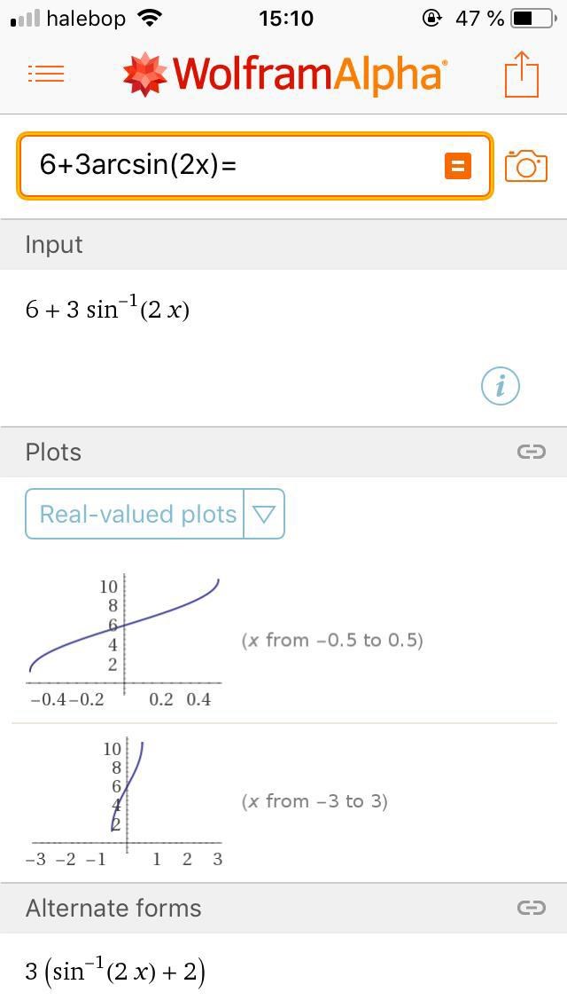Uppgiften är att rita grafen till f(x)= 6+3 arcsin 2x och ange Df^-1 samt Vf^-1