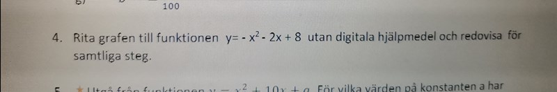 Lös ekvtionen -x2-8x+8 = 0.  Rita in nollställena. Markera var symmetrilinjen är (mitt emellan nollställena). Beräkna y-värdet för maximipunkten. Titta efter vad jag behöver mer för värden för att kunna rita en snygg kurva. *Markera punkten och dess spegelbild. Repetera från * tills man kan rita kurvan.