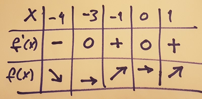 - grafen ligger över x-axeln (dvs f'(x) > 0) då -3 < x < 0. Alltså ska det stå ett plustecken i tabellen under x = -1.