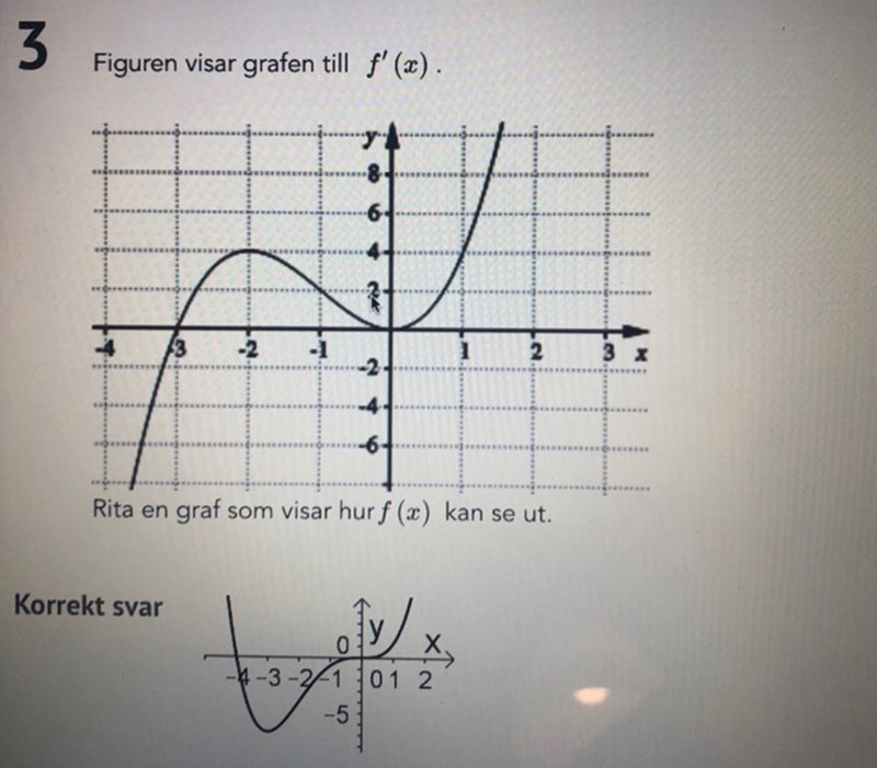 - Vi ser grafen till derivatafunktionen f'(x) i uppgiften.