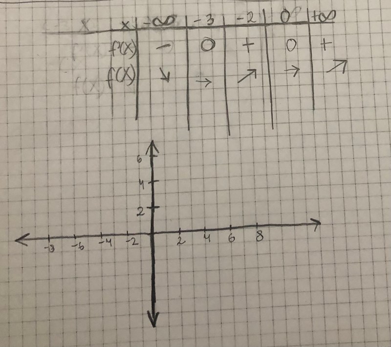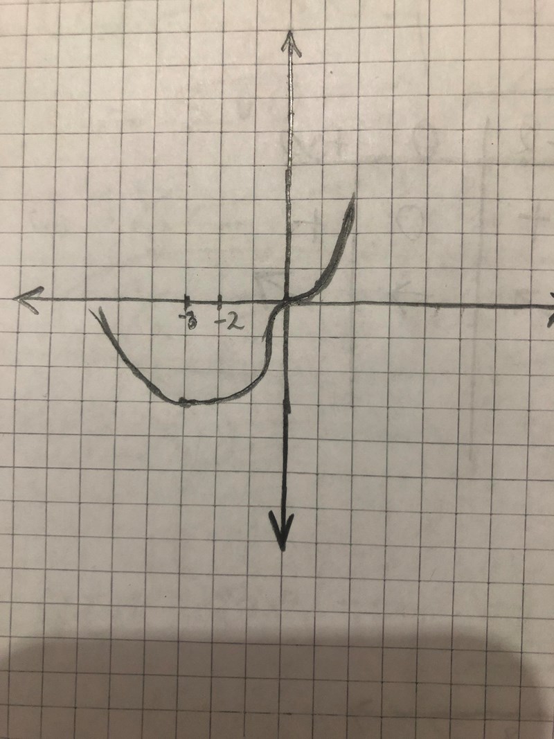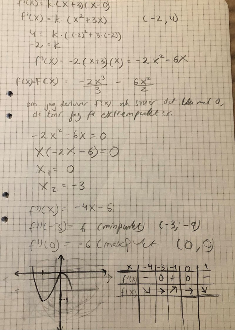 Jag blir förvirrad av att derivatan är noll då x=-3 och då x=0. Det är hur man gör teckentabellen som förrvirrar mig för grafen visar derivatan, det är inte en vanlig runtom utan derivatan .. Så det känns lite svårare att tolka vart derivatan är 0, vart finns en maxpunkt och vart finns en minpunkt..osv