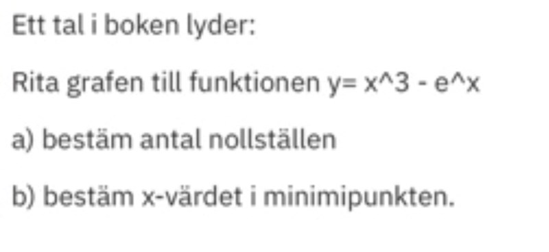 Nollställen är då y = 0 inte x = 0, alltså funktionen skär x-axeln. Ekvationen blir istället 0 = x^3 - e^x, som jag skulle säga inte går att lösa utan miniräknare, så det är inte det man ska göra. Notera att de vill ha antal nollställen, inte vilka x som är nollställen. Man ska undersöka derivatan och på så sätt med teckentabell etc lista ut hur många gånger funktionen måste passera x-axeln. Uppgiften handlar alltså om derivata och grafskiss snarare än om att "lösa en ekvation". Är detta något du känner att du har koll på?