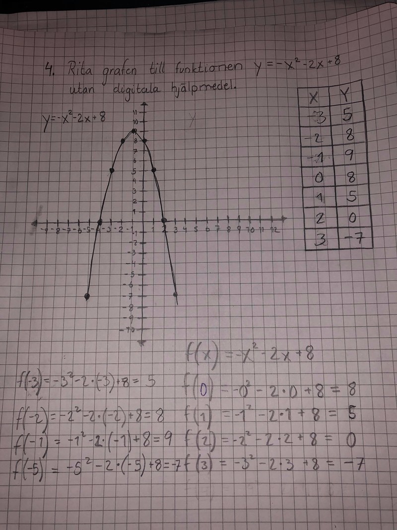 Jag ska rita grafen till funktionen y= x^2-2x+8 och jag började med att göra en värdetabell där jag lät X vara 0, 1, 2, 3, 4, 5 och 6. Och började sätta in varje varje x i funktionen för att rita upp grafen. jag fick fram att när X är 0 så är Y=8, när X är 1 så är Y=5, samt när x=2 är y=0, x=3 y= -7 och när x=3 då blir y= -16. Jag märker att den visar bara toppen på kurvan samt hur långt ner den går. Antar att jag har satt in fel X tal i värdetabellen för att sedan räkna ut? Är det där felet ligger?