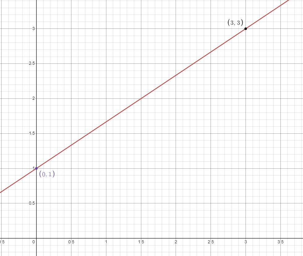 Beräkna y för dina x och få två punker: (0;1) och (3;3).