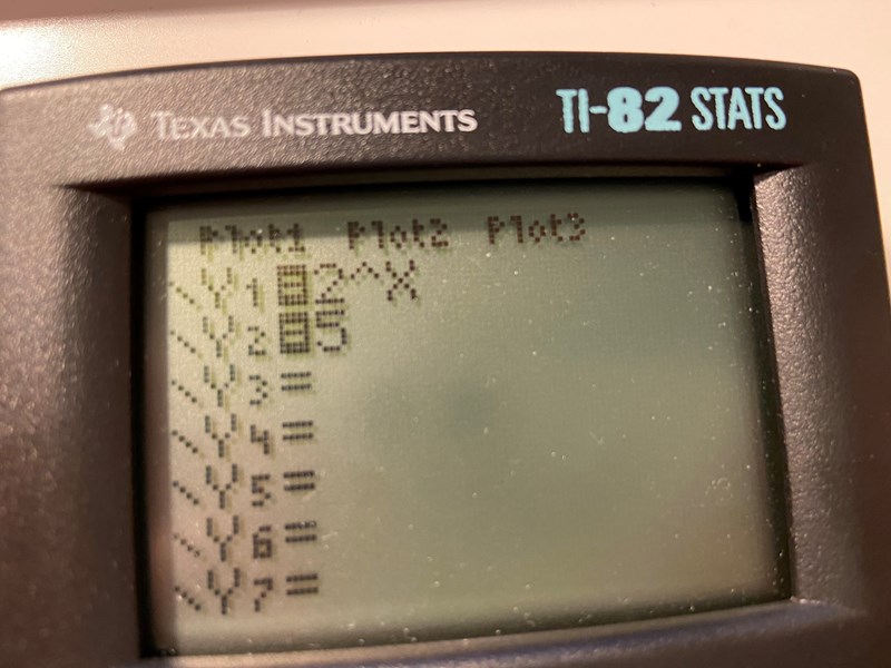 Jag skriver att y1=2^x och y2=5. Är det som har fel?