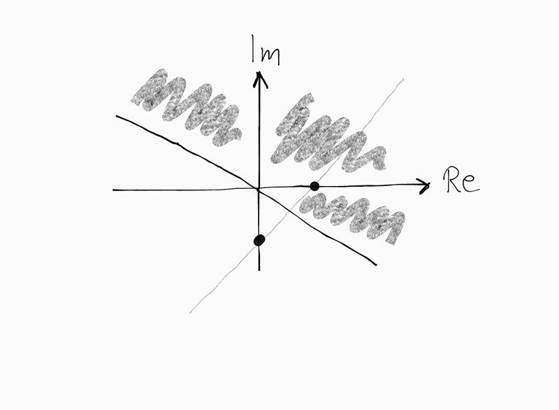 Talen 1 och -i. Du skall ju hitta allapunkter som ligger närmare punkten (1,0) än punkten (0,-1) om vi ser det komplexa talplanet som ett vanligt koordinatsystem.