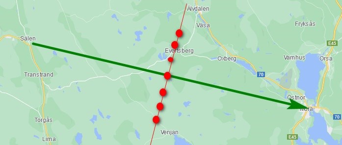 Där har jag hittar punkten mittemellan Sälen och Mora, och sedan ritat röd linje vinkelrätt mot den gröna linje som går mellan Sälen och Mora.