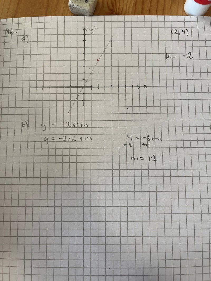 Bra början att du ritat upp ett koordinatsystem och ritat in punkten (2,4) (även om du har glömt att ange skalan). Hur ser en linje med k=2 och skärning i origo ut? (rita!)