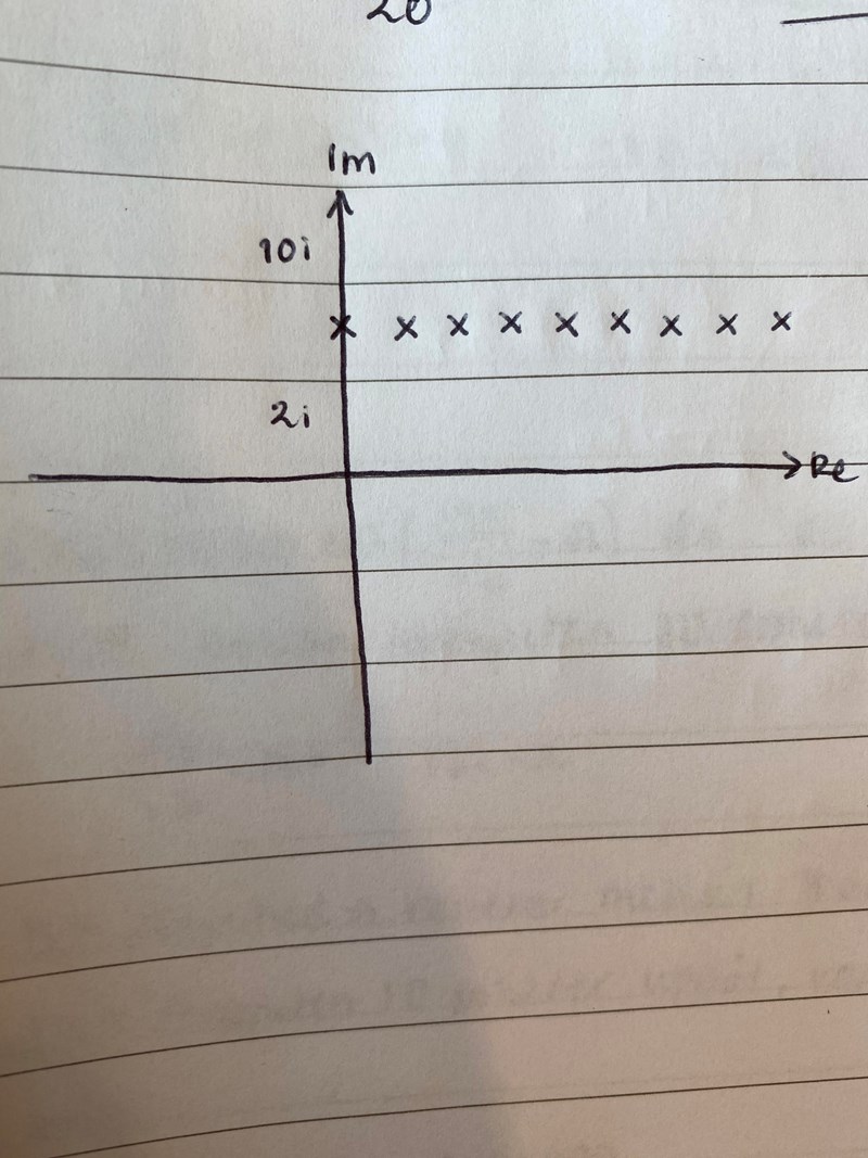 Punkten z ska ha egenskapen: Avståndet mellan punkt och fixpunkten z=2i ska vara lika stort som avståndet mellan punkt och fixpunkten z=10i.