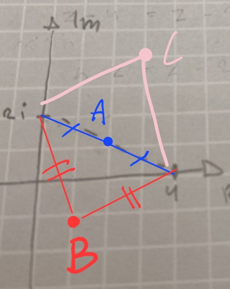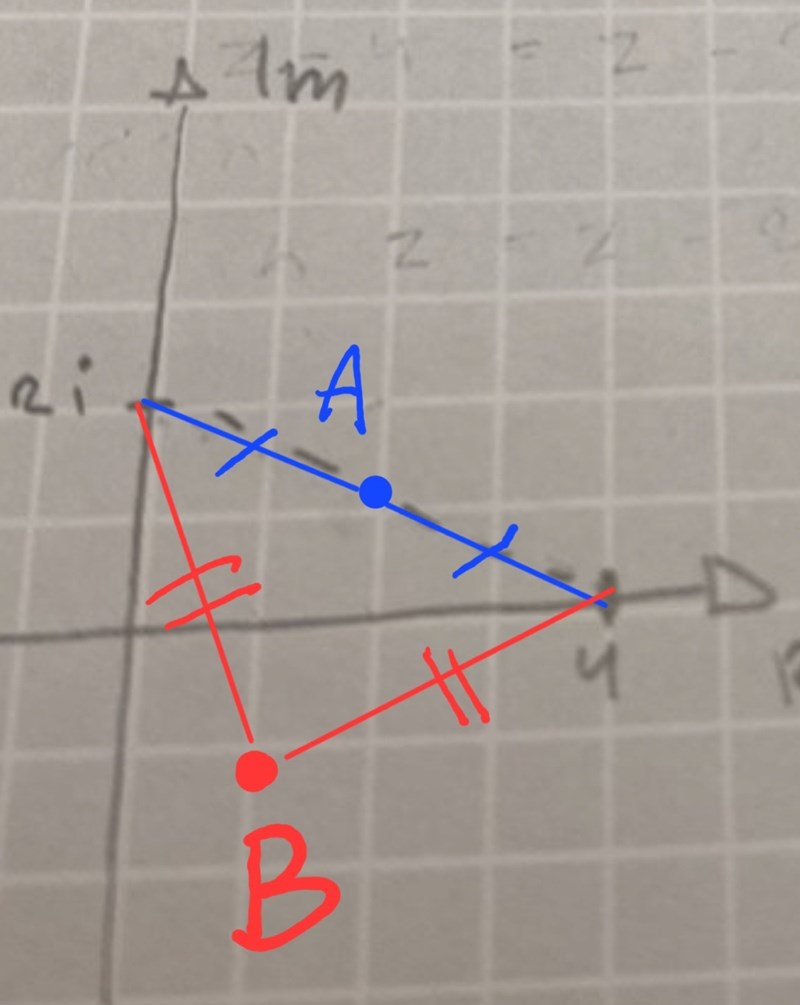 jag har ritat markerat 4 och 2i och jag tänkte om man hittat hypotenusan mellan de borde då z ligga i mitten av det för då blir ju avståndet lika långt eller tänker jag fel