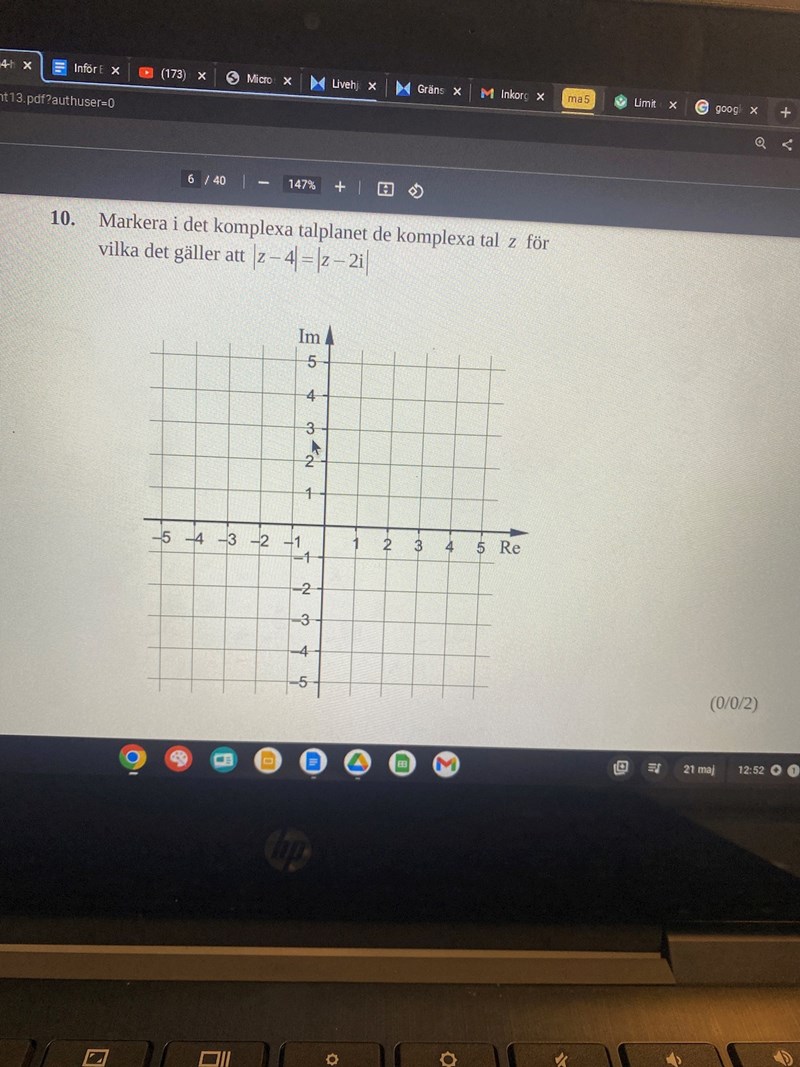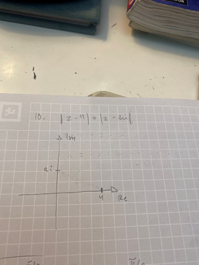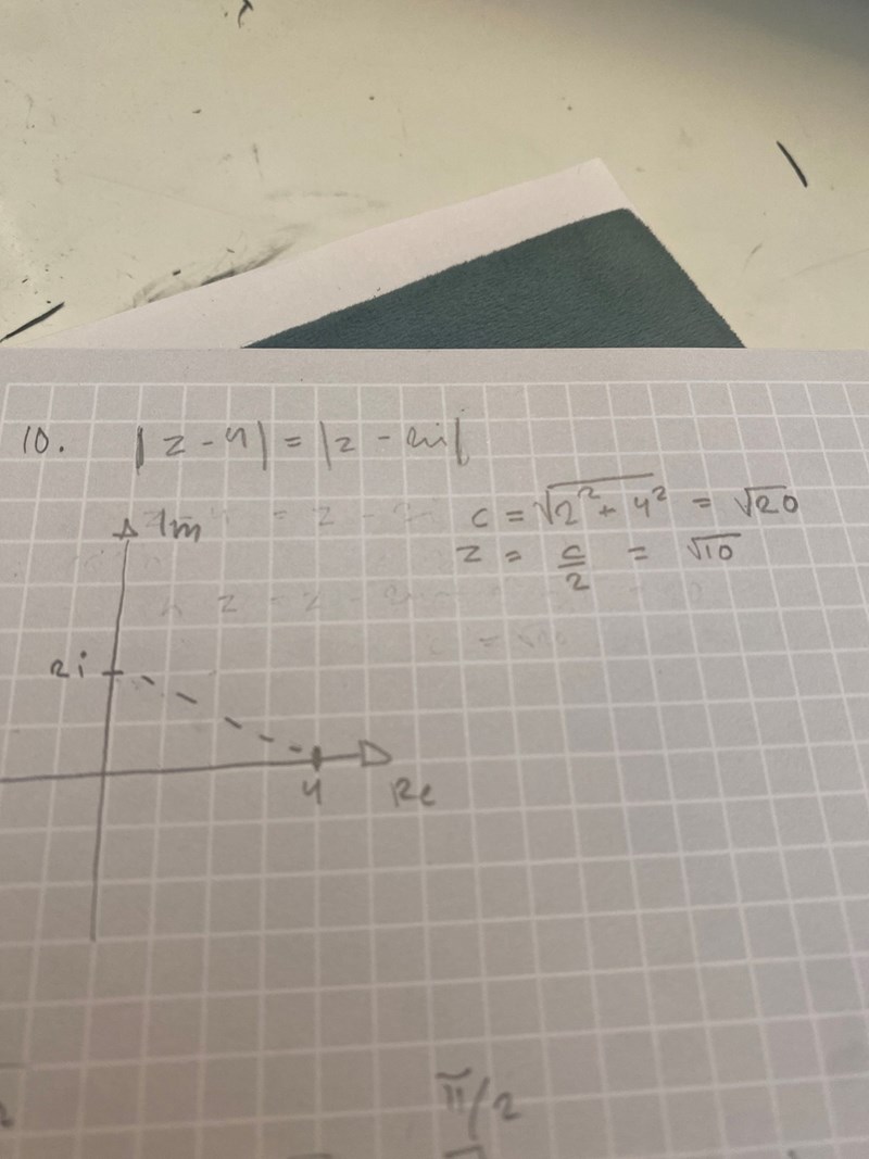 Fundera på vilka komplexa tal z som uppfyller villkoret att avståndet från z till 4 är lika långt som avståndet till 2i