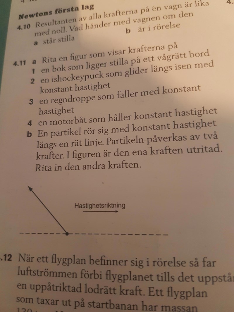Jroth skrev:För att ett föremål ska befinna sig i vila eller konstant rörelse (ingen hastighetsförändring) måste resultanten av alla krafter på föremålet vara noll.