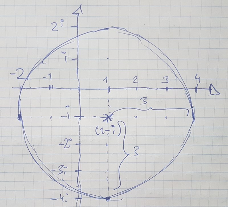 Din cirkels medelpunkt är -1+i men den ska vara 1+i eftersom z - 1 + i = z - (1-i).