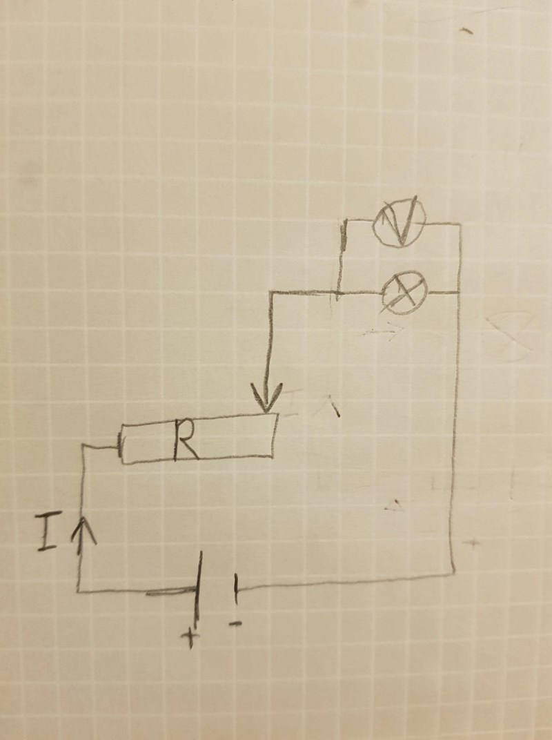 Bilden ovan är en kopplingsschema över följande bild(spänningsaggregat, lampa, reostat) .Undrar om det stämmer eller är den felritad?Strömmen mäts genoms pänningsaggregatet men spänningen,V mäts med en multimeter