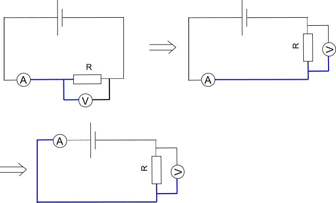 De linjerna visar bara hur de olika delarna är kopplade till varandra och har ingen inverkan på hur kretsen fungerar. Om linjen är lång, kort, krokig eller granar upp sig har ingen betydelse. T.ex: