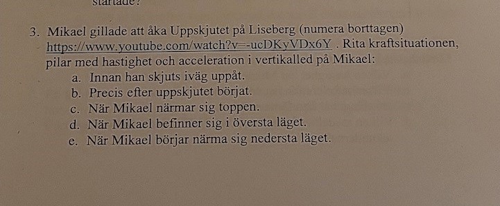 Hej! Jag löste nyss uppgift 3 med några småfel här och där. Sedan när jag tittade i facit kände jag att jag förstod varför jag hade fel, däremot känner jag fortfarande att det inte riktigt sitter. Därför undrar jag om någon skulle vilja förklara hur de tänker när det gäller sådana uppgifter? (När FN > Fg och motsatsen, samt när a = - 9.82 och allt annat som uppgiften kräver...)