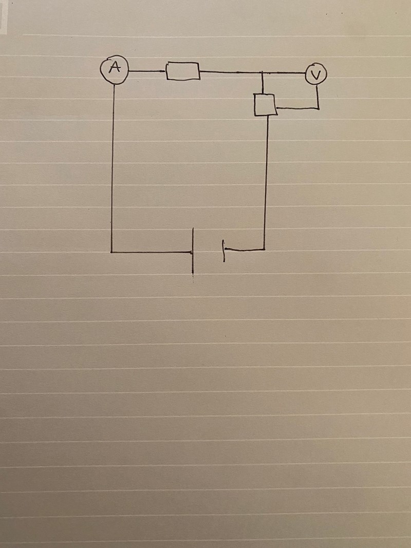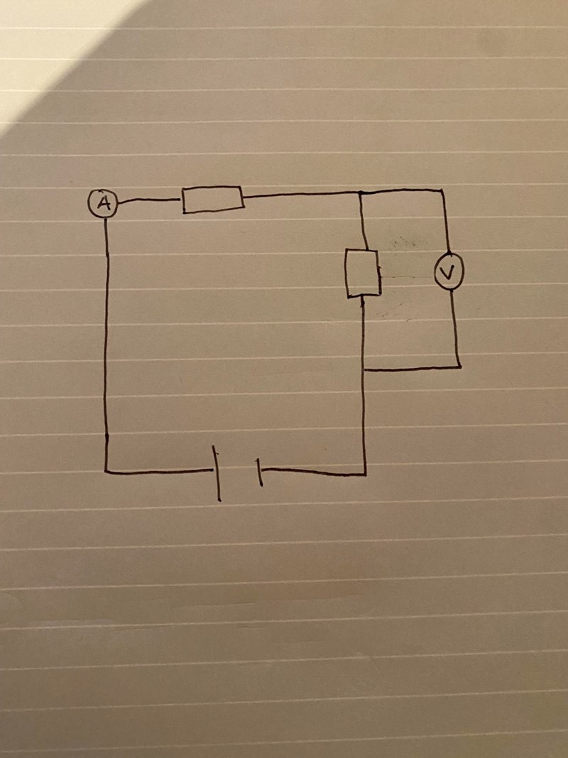 Ja, voltmetern har ju 2 sladdar och är inkopplad parallellt över det det vita motståndet. Kolla sen mot bilden i frågan så du är säker på att allt är kopplat som i ditt schema.