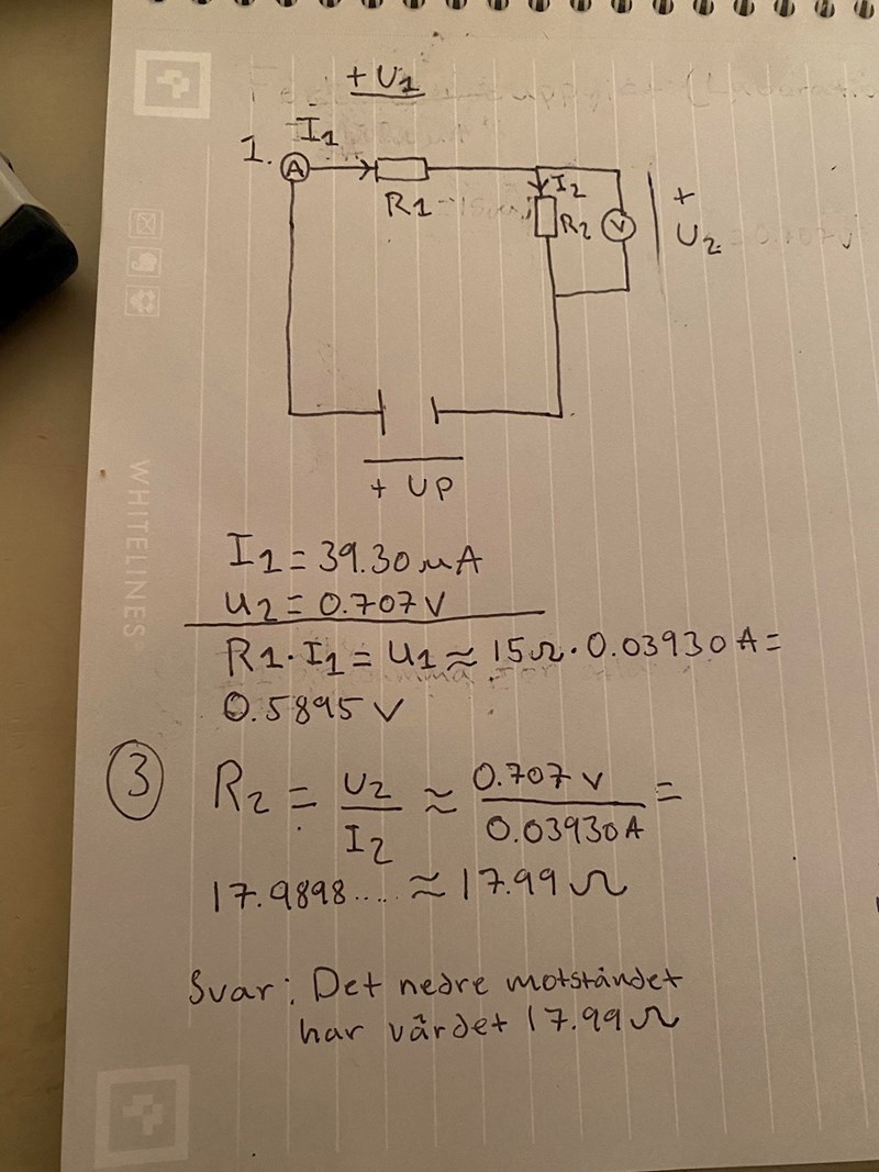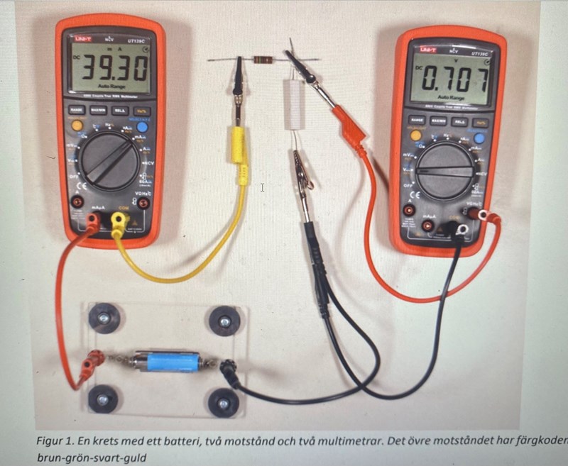 På bilden ser man att har du anslutit voltmetern över det vita motståndet, dvs en klämma var på det vita motståndets ben.