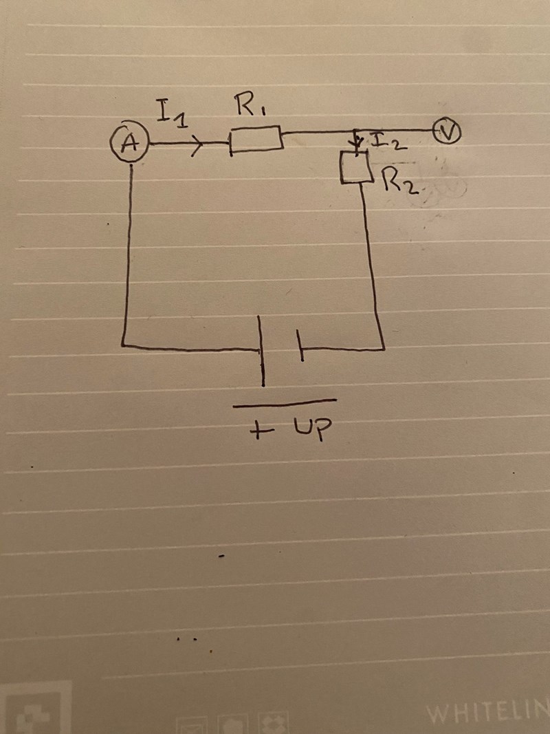 Den uppmätta spänningen U är spänningen över motståndet R. Det uppmätta I är samma i hela slingan, alltså även genom motståndet. Ohms lag R=U/I.