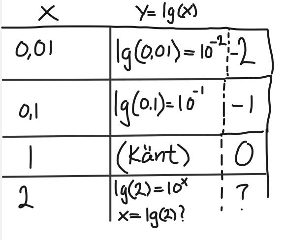 Smaragdalena skrev:Kommer du ihåg några andra värden som kan vara användbara? För egen del har det fastnat att roten ut 10 är 3,16 och att 100,3 = 2 ungefär. Sedan kan du nog fundera ut några värden till med hjälp av logaritmlagarna.
